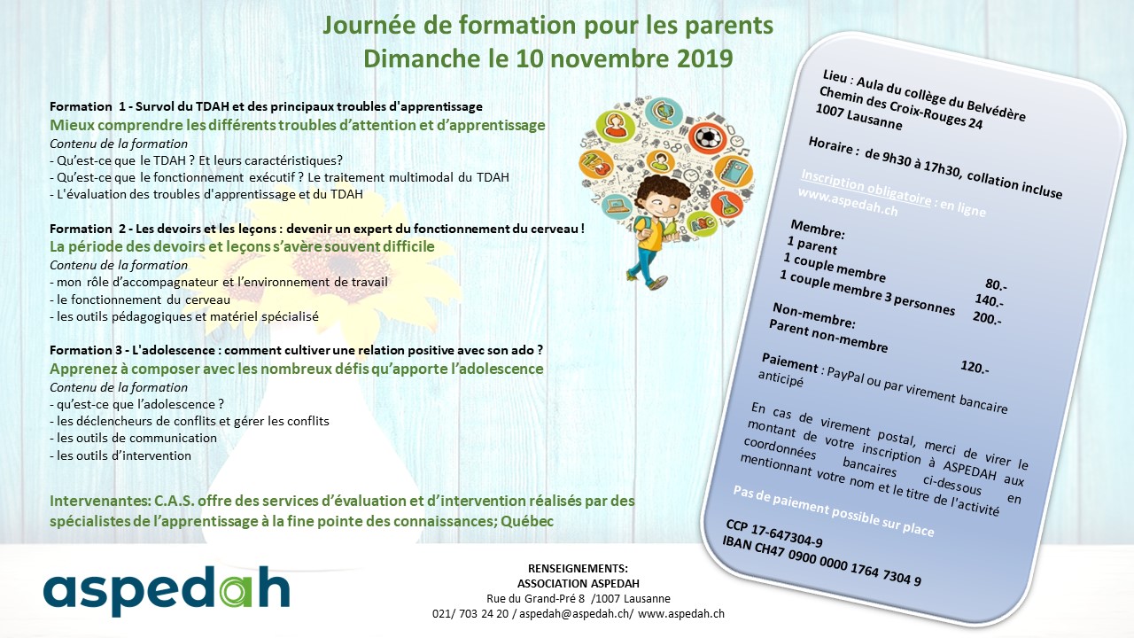 Cette formation s'adresse principalement aux parents de jeunes âgés entre 5 et 17 ans présentant un trouble du déficit de l'attention avec ou sans hyperactivité/impulsivité (TDAH). Cette formation propose un éclairage du TDAH basée sur la littérature scientifique et l'expertise clinique récente afin de donner l'opportunité aux parents, grand-parents, maman de jour, etc. de mieux appréhender le TDAH, ses impacts fonctionnels et ses manifestations dans la vie de tous les jours et à l'école. Les différentes approches d'intervention et stratégies seront expliquées en théorie et cas pratiques, afin d'être en mesure de mieux les accompagner tout au long de leurs apprentissages, tant au niveau des devoirs, de la mise en place de comportements adéquats que de la capacité à mieux s'autoréguler par le développement des habilités sociales, notamment.