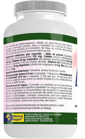 Composition : L-Théanine - Huile de poisson - Cataire - Vitamines B 6 : 12, 5 mg - Magnésium : 6 mg - Zinc : 3 mg.